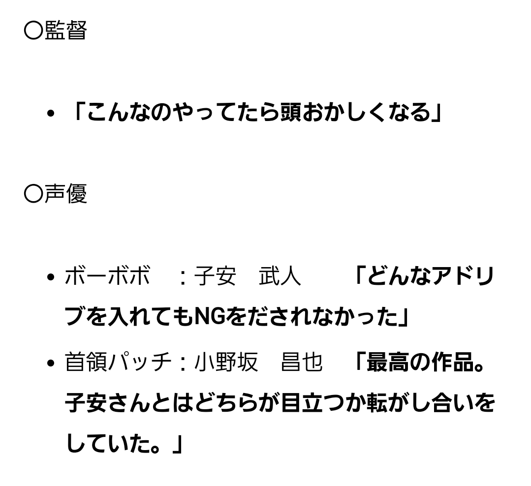 | … | 18無念Nameとしあき26/02/19(木)13:50:46No.1388457093そうだねx3ボーボボの打ち上げでまだボーボボで役貰ってない置鮎が参加してその後に3世の声獲得したの笑ったな |