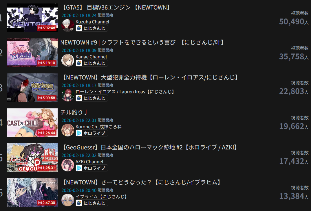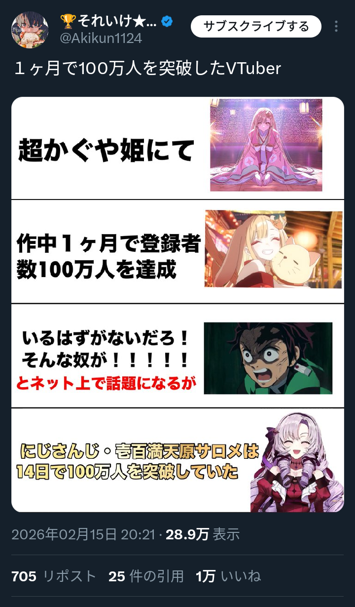| … | 89無念Nameとしあき26/02/19(木)14:14:08No.1388460648+>にじ女Vだと次の100万人は順当に笹木かアンジュなんだけど |