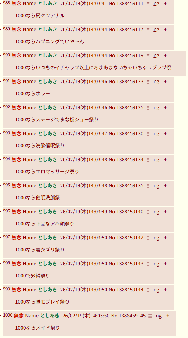 | … | 72無念Nameとしあき26/02/19(木)14:31:27No.1388463416そうだねx4>>1000なら着衣ズリ祭り |