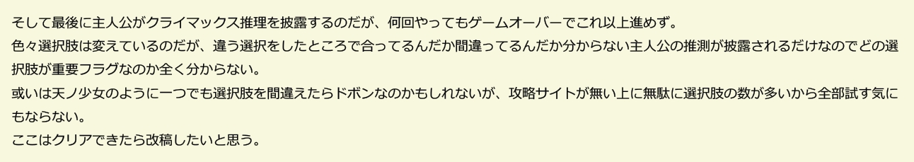 | … | 2無念Nameとしあき26/02/19(木)20:50:13No.1388537538+ニューゲームからスキップで3〜4分、ちゃんと読むと1時間くらいで真犯人当てる選択肢が出るんだけどちゃんとフラグ立てないとその真犯人の選択肢が出てこないっぽくて詰んでる |