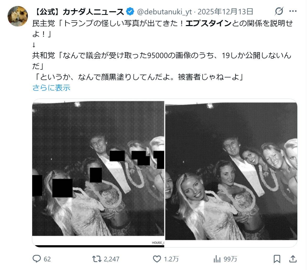 | … | 89無念Nameとしあき26/02/19(木)21:13:09No.1388544236そうだねx1>こういうの見てるとなんでトランプはあんな熱心に公開したがったのか逆に謎だね |
