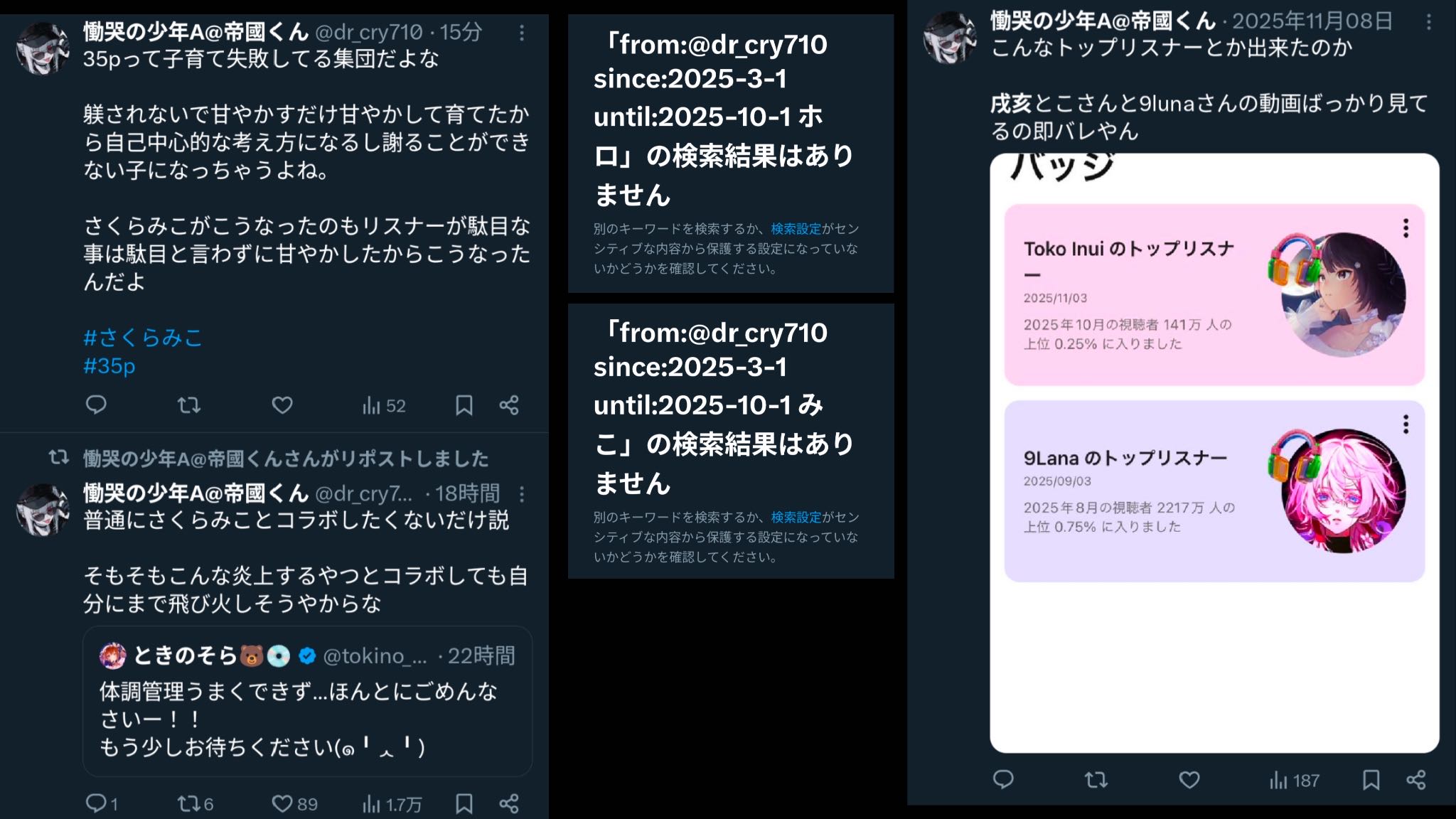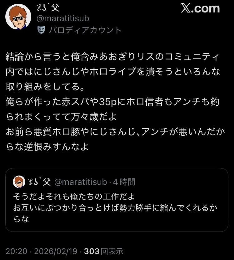 | … | 78無念Nameとしあき26/02/20(金)09:37:16No.1388630240+なぜホロライブ粘着スレのおフェラ座の怪人がにじさんじを擁護してるのか理解に苦しむね(ペチペチ |