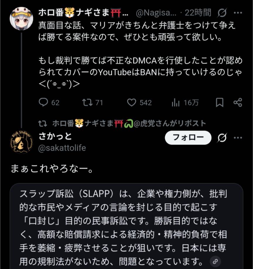 | … | 63無念Nameとしあき26/02/20(金)09:05:57No.1388627254そうだねx1>スラップ訴訟なんでマリアの勝ちじゃよ |