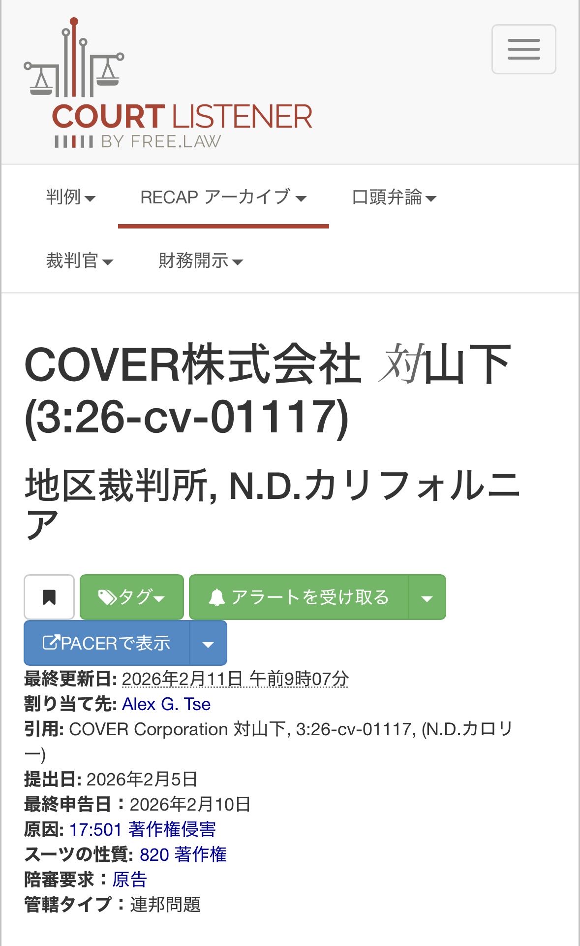 | … | 56無念Nameとしあき26/02/20(金)08:52:26No.1388625989そうだねx4COVER Corporation v. Yamashita (3:26-cv-01117) |