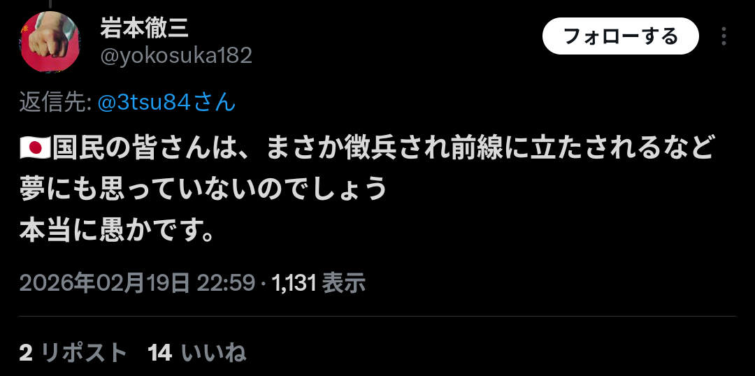 | … | 36無念Nameとしあき26/02/20(金)09:48:55No.1388631505+こういう人らの想定する戦争っていうのは米帝の侵略戦争に日本人も加担させられるってもんだよ |