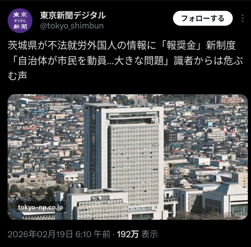 | … | 2無念Nameとしあき26/02/20(金)21:51:37No.1388764803そうだねx6茨城県が不法就労情報に報奨金導入 大井川知事「まじめな外国人労働者、不安に陥れない」 |