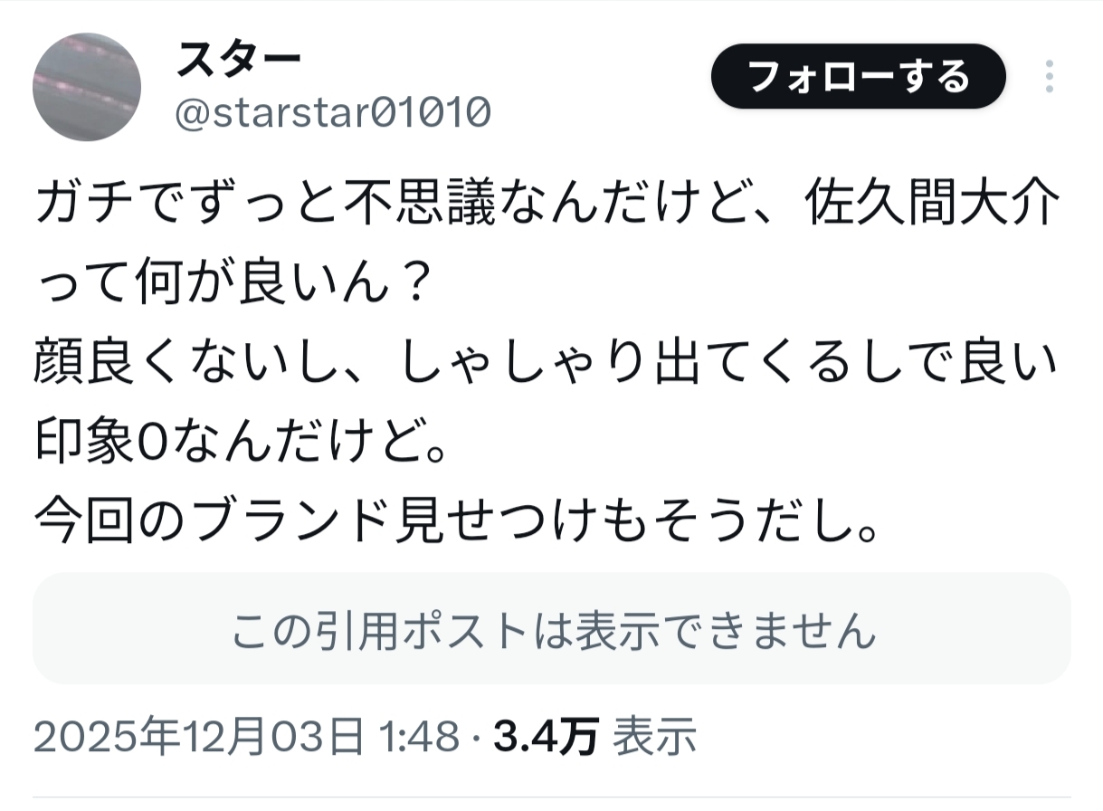 | … | 68無念Nameとしあき26/02/20(金)23:36:41No.1388795565そうだねx1>佐久間大介はVTuberの星街すいせい絡みで変なアンチがいるかもね |