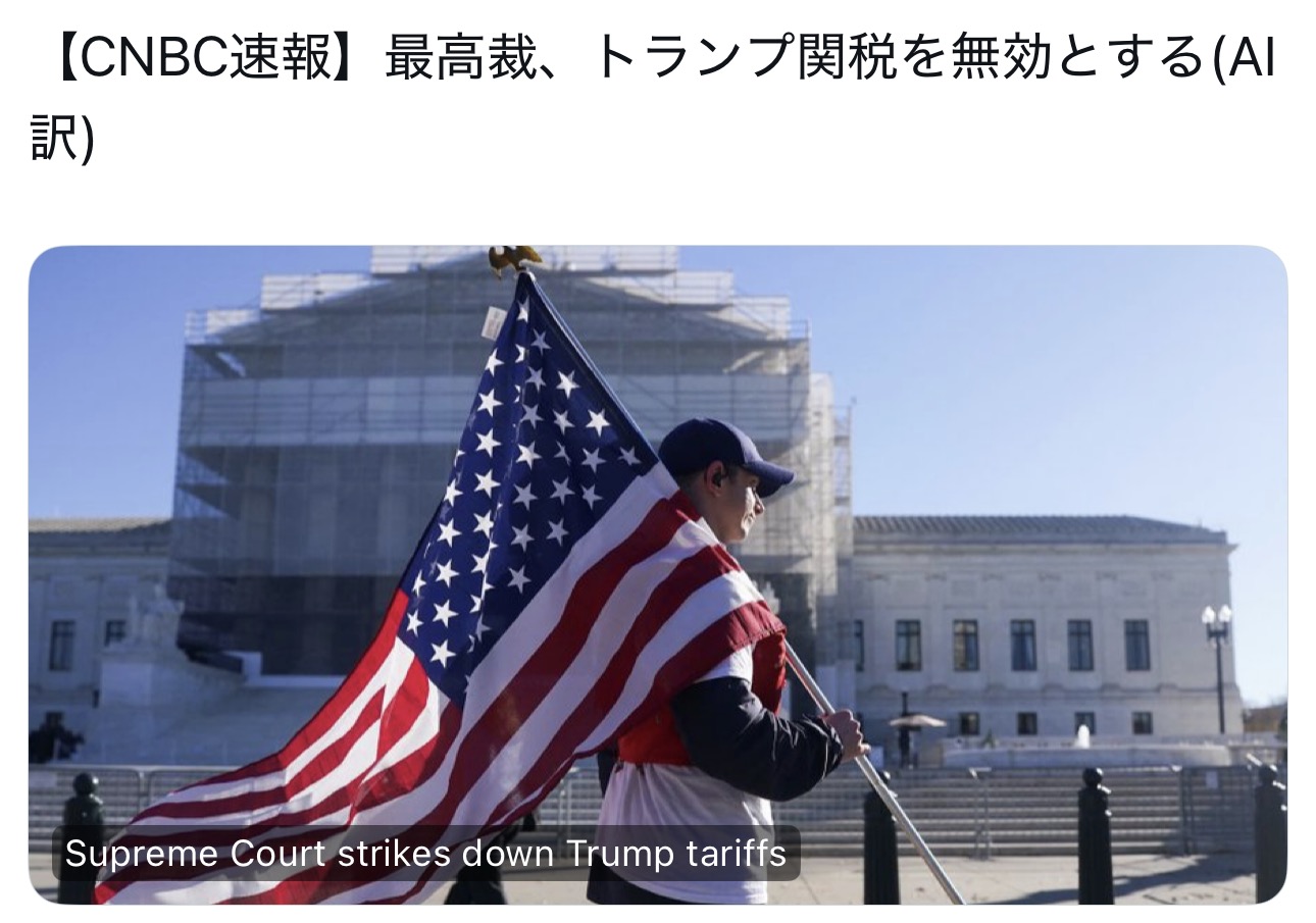 | … | 384無念Nameとしあき26/02/21(土)00:19:04 ID:SCfQZ7w6No.1388804645そうだねx1>>政権当局者は、最高裁がIEEPA(国際緊急経済権限法=トランプ大統領令)関税を違法と判断した場合でも、 |