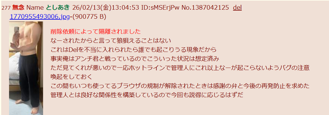 | … | 118無念Nameとしあき26/02/21(土)12:13:52No.1388879693+気持ち悪い半裸写真貼り付ける人アク禁になったんだ |