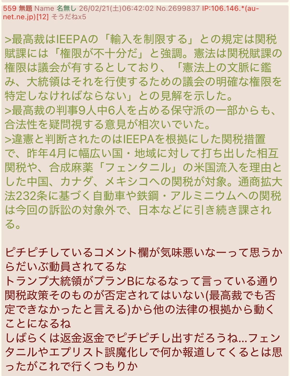 | … | 529無念Nameとしあき26/02/21(土)12:25:49No.1388882054+>最高裁判所の判決なんか知らん!!!全世界に10%追加関税だ!!!!!!!! |