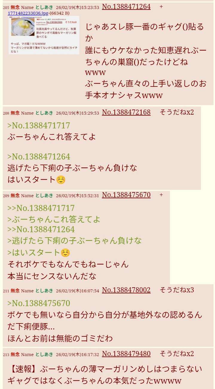 | … | 38無念Nameとしあき26/02/21(土)11:57:48No.1388876450+>下痢豚悔しかったら「知恵遅れの巣窟じょん」と泣いて良いんだよ |