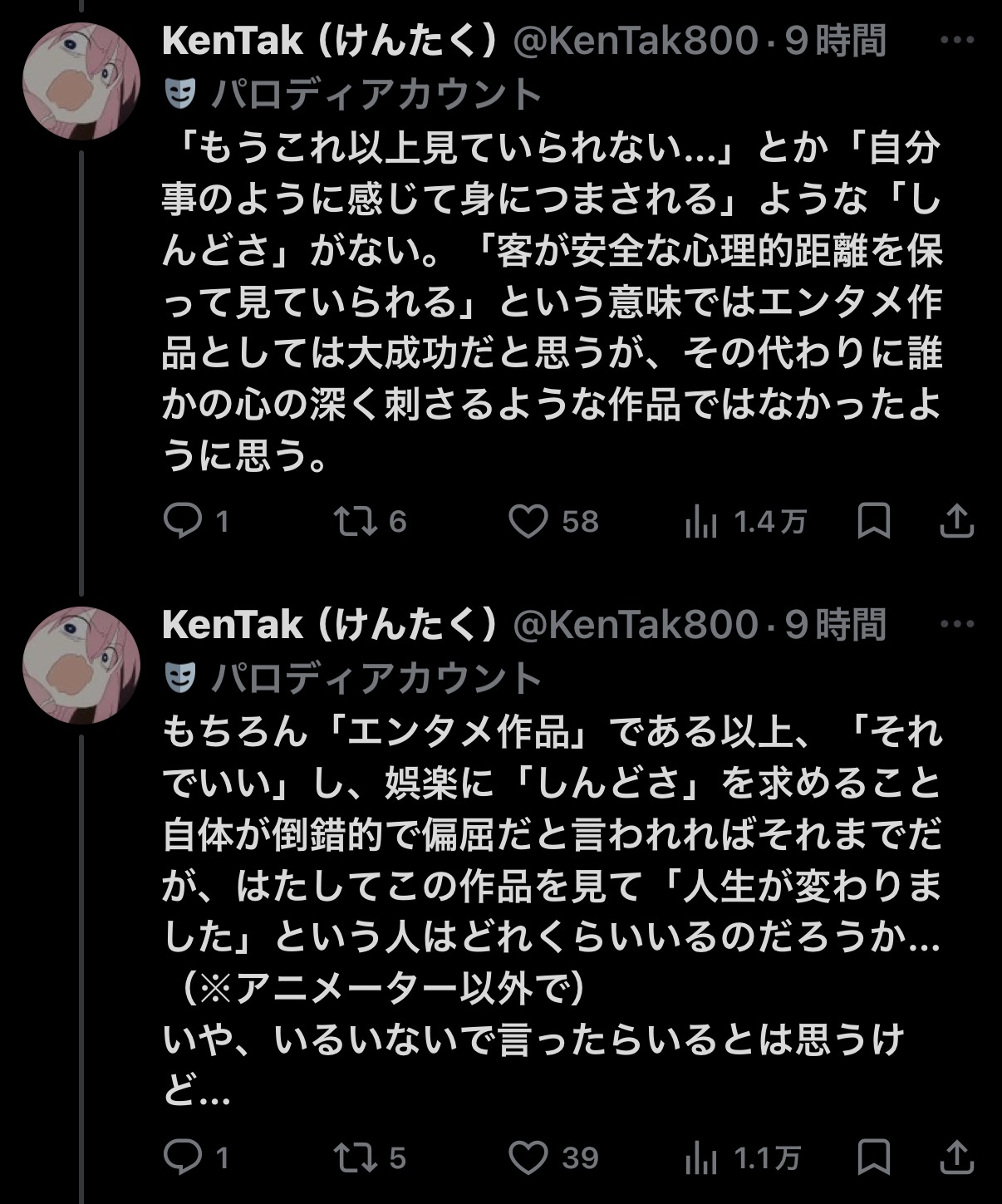 | … | 269無念Nameとしあき26/02/23(月)07:27:13No.1389396821そうだねx2>正直そこまで熱量出して批判するほどの作品ではないでしょ |