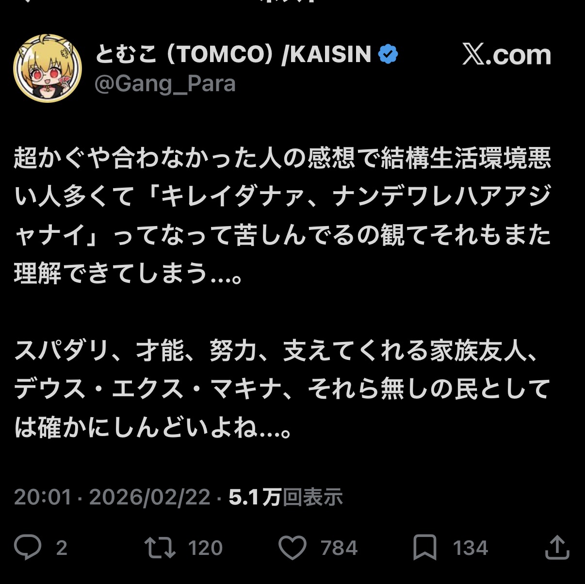 | … | 82無念Nameとしあき26/02/23(月)06:20:55No.1389392738そうだねx2感性がテイカー基質な上に性格悪いだけじゃんnoteまで書いちゃって |