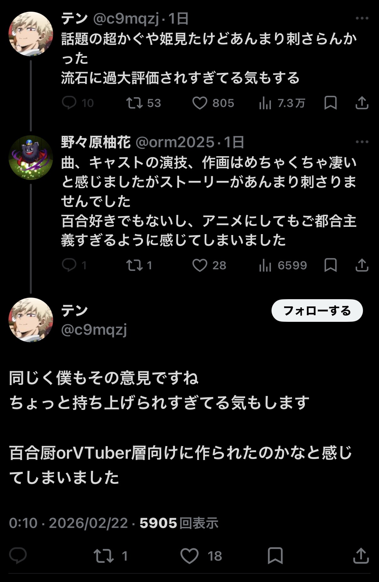 | … | 72無念Nameとしあき26/02/23(月)06:14:43No.1389392476そうだねx1アニメ見て心動かしてもらおうとかメッセージ性がないとか言うのは本人の感性もだけど |