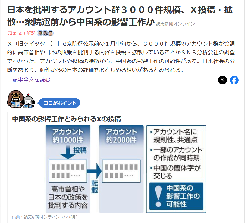 | … | 39中国が組織的に「反高市」工作「旧統一教会」と関連付けNameとしあき26/02/24(火)07:00:13No.1389654452+日本経済新聞は22日、先の衆議院議員総選挙で、中国系とみられる約400のアカウントがX(旧ツイッター)上で組織的な「反高市工作」を展開していたと報じ、SNS上で話題になっている。 |