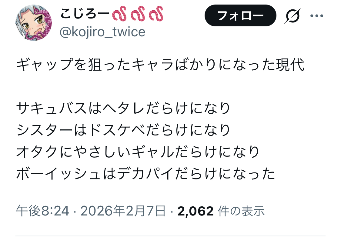 | … | 25無念Nameとしあき26/02/23(月)23:54:12No.1389624890+ギャップな事を知ってるのは視聴者だけでキャラは知らないから意識しすぎるとファンタジーじゃなくなる |