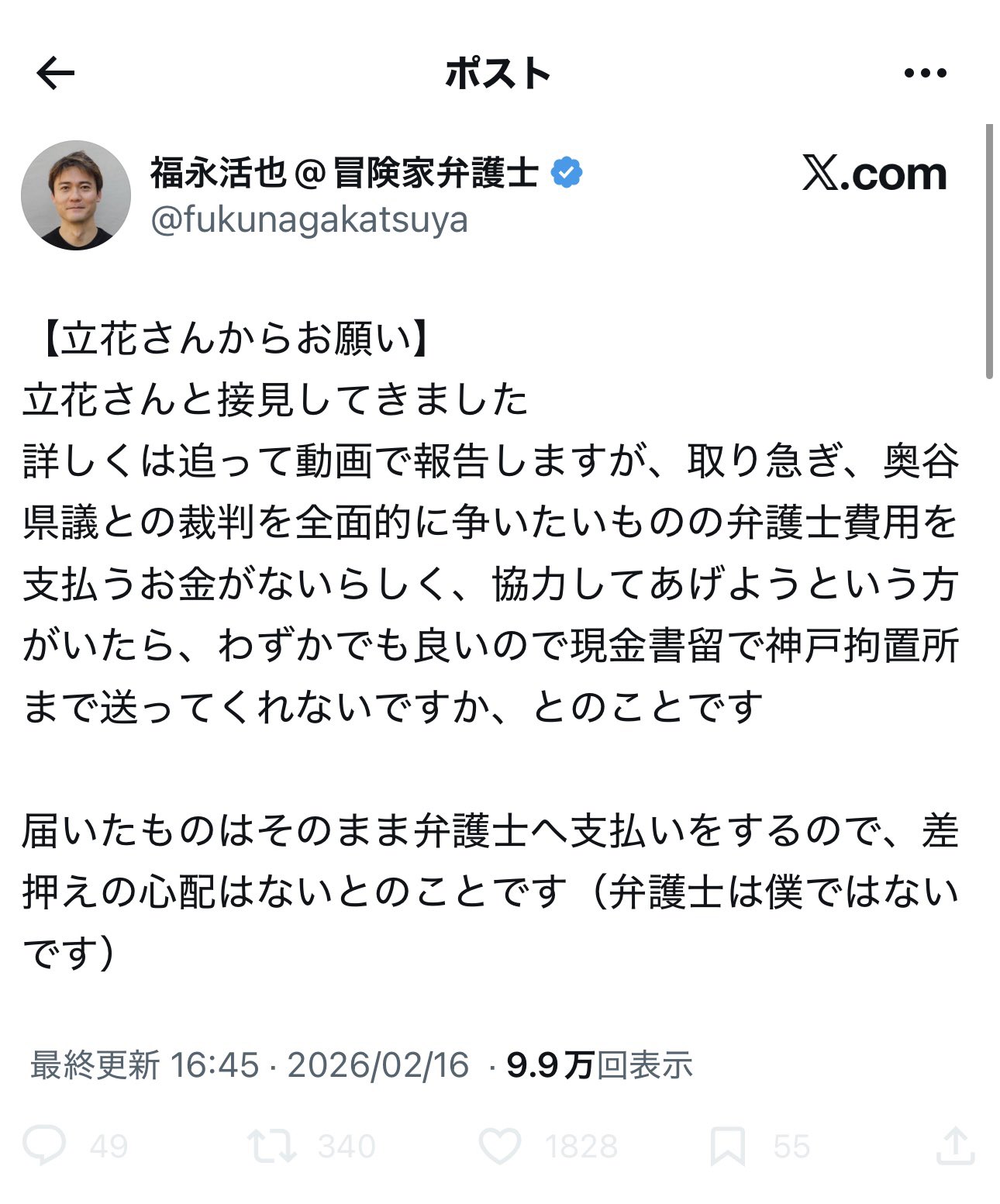 | … | 17無念Nameとしあき26/02/24(火)06:04:10No.1389652091そうだねx1>接見した弁護士が被告の金品募るメッセージ伝えたりするのってアウトだったはずだが |