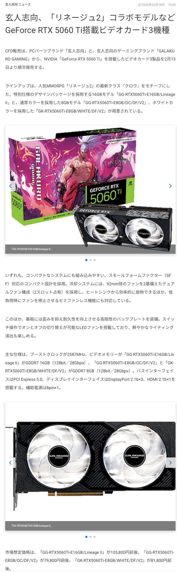 | … | 182無念Nameとしあき26/02/24(火)09:53:42No.1389670606+>ただ3060の12GBの中古高く買うよりはいいだろって |