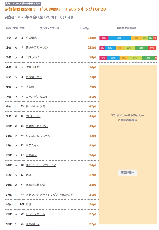 | … | 284無念Nameとしあき26/02/25(水)00:53:20No.1389845044+ 1771948400508.jpg-(171863 B) 一般の配信人気は呪術とフリーレンの二強 |