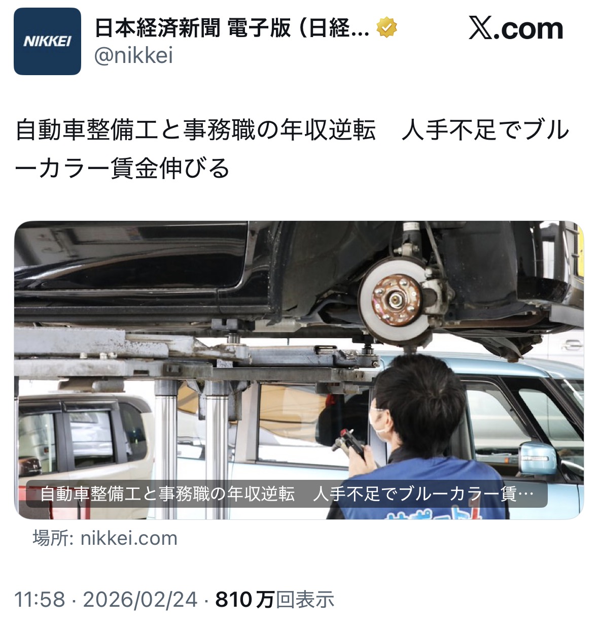 | … | 20無念Nameとしあき26/02/25(水)10:39:12No.1389891448そうだねx6これ整備工の収入が増えたんじゃなく、ついに事務職が整備工以下の収入まで下がったってことだからな |