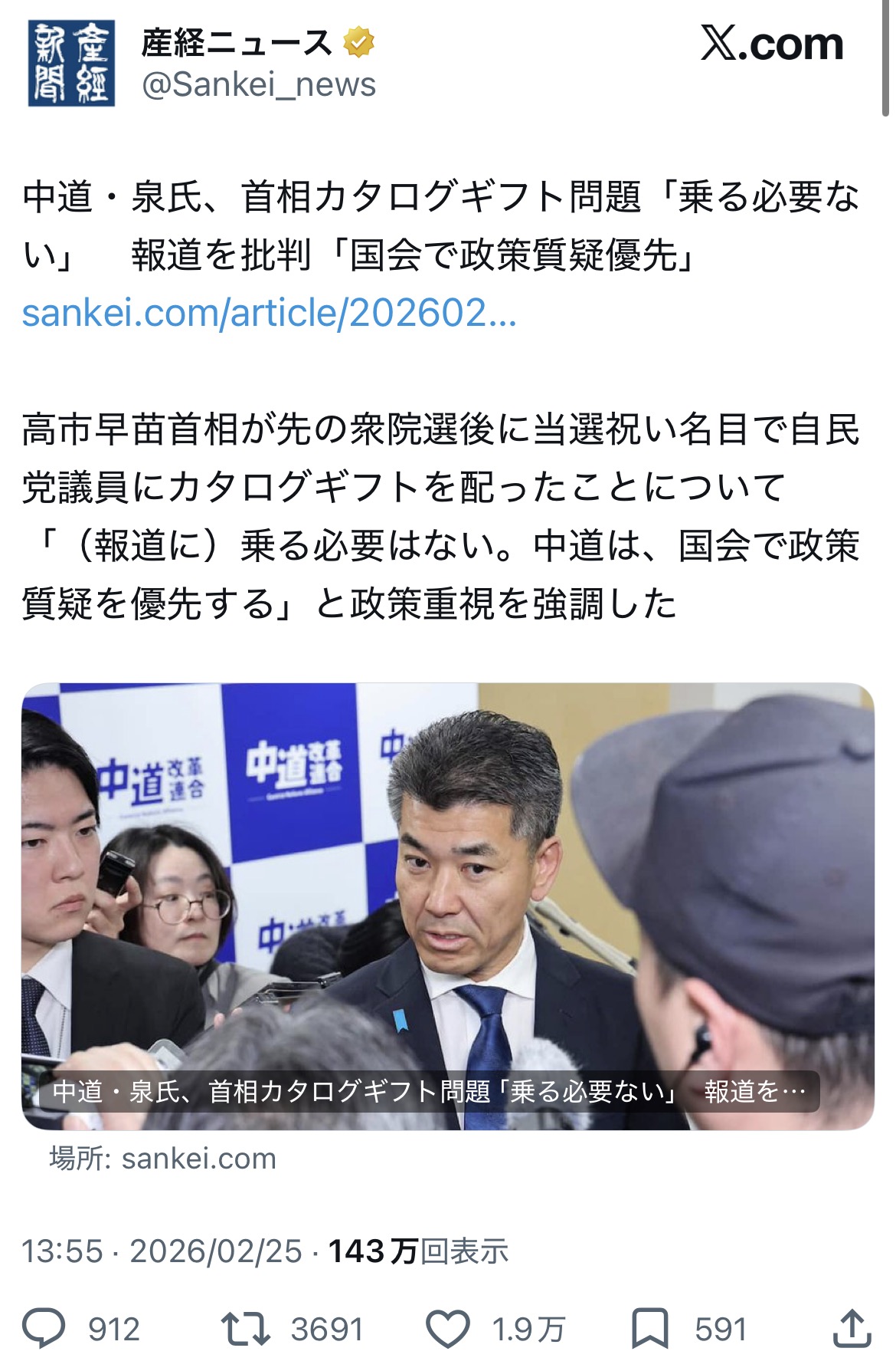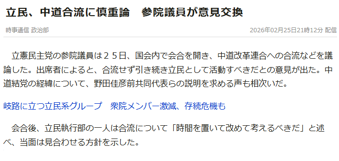 | … | 955無念Nameとしあき26/02/25(水)22:55:37No.1390044513+>泉だけじゃなくて中道合流した立憲系議員全員もう終わりなんだよな |