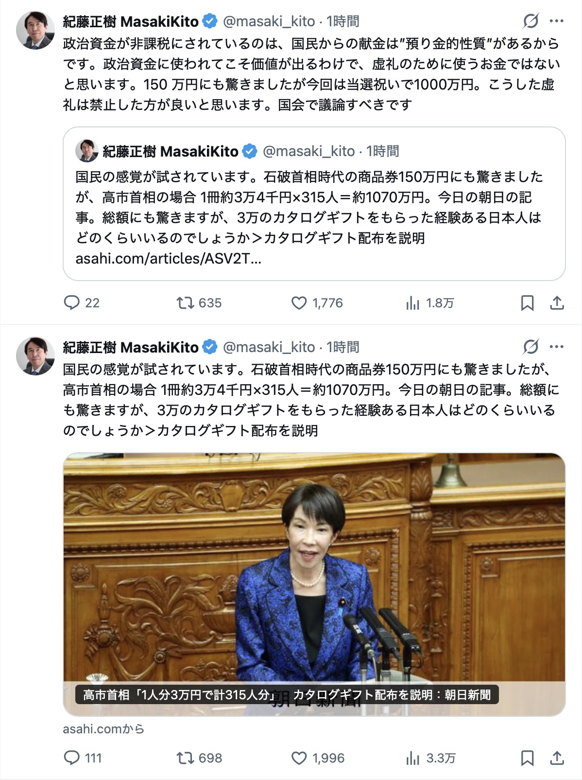 紀藤弁護士、高市総理を批判か「カタログギフトに1000万は驚き。このような虚礼は禁止したほうがよい」削除された記事が1件あります.見る