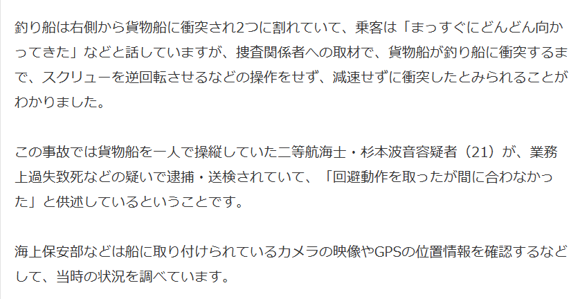 | … | 12無念Nameとしあき26/02/25(水)22:18:37No.1390034270そうだねx11 1772025517136.webp-(263922 B) >21歳ってほとんど経験積んでないんじゃないか?それで1人で操船させていたの? |