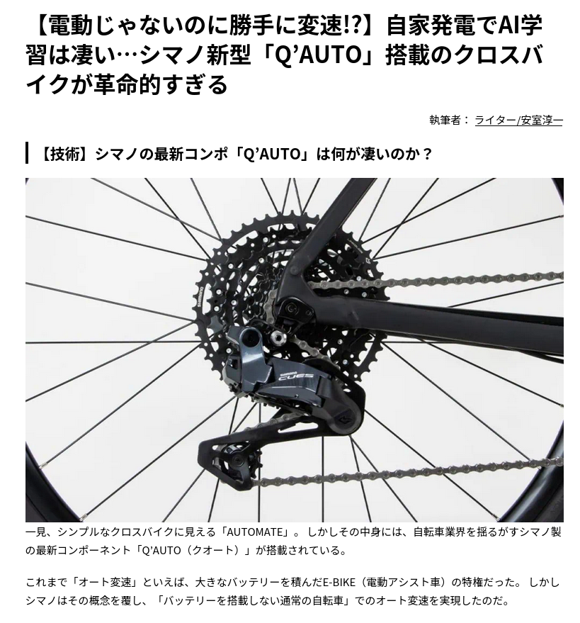 シマノの新型コンポ、最新AIを使った自動変速機能が凄すぎると話題に削除された記事が1件あります.見る