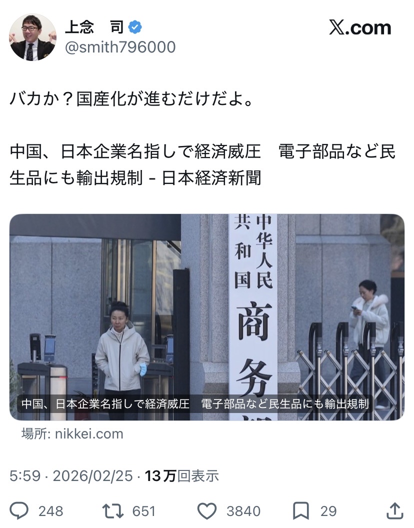 【高市部品】上念司さん、中国の対日輸出規制を痛烈批判「国産化が進むだけ」削除された記事が1件あります.見る