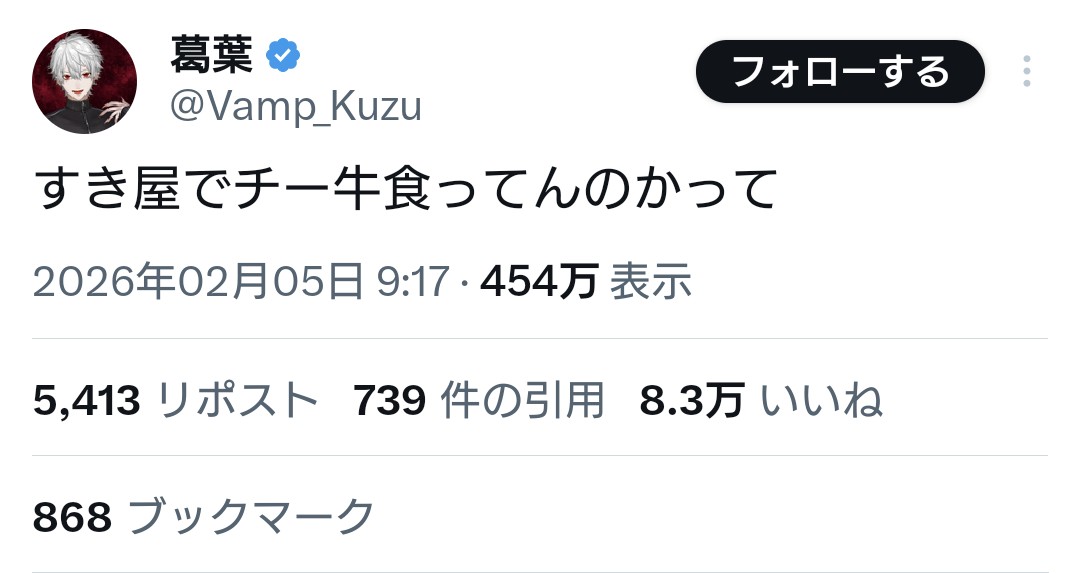 | … | 743無念Nameとしあき26/02/26(木)08:34:08No.1390093543そうだねx2>箱置いといてもそもそもイケメン男Vのファンに牛丼食わせるのって相性微妙じゃないかと思う |