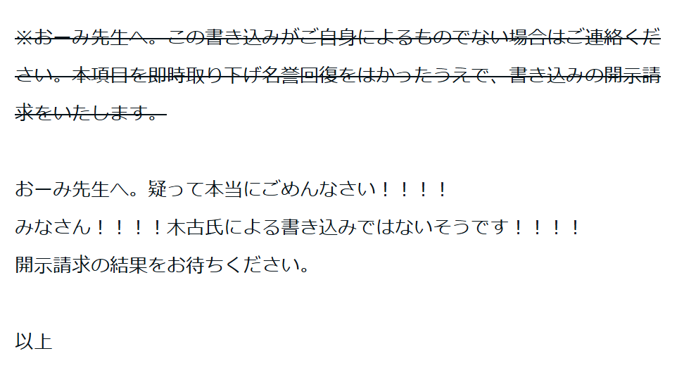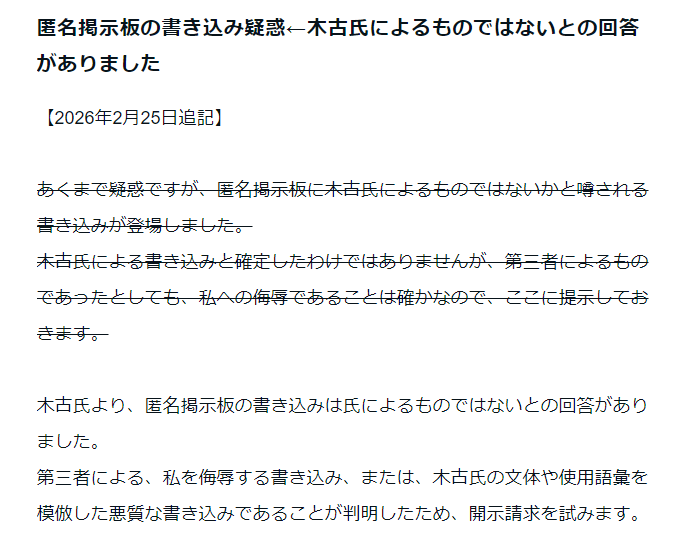 | … | 352無念Nameとしあき26/02/26(木)08:01:21No.1390090405+>Hさんの訂正文のテンションがそれまでのものと違う…これって… |