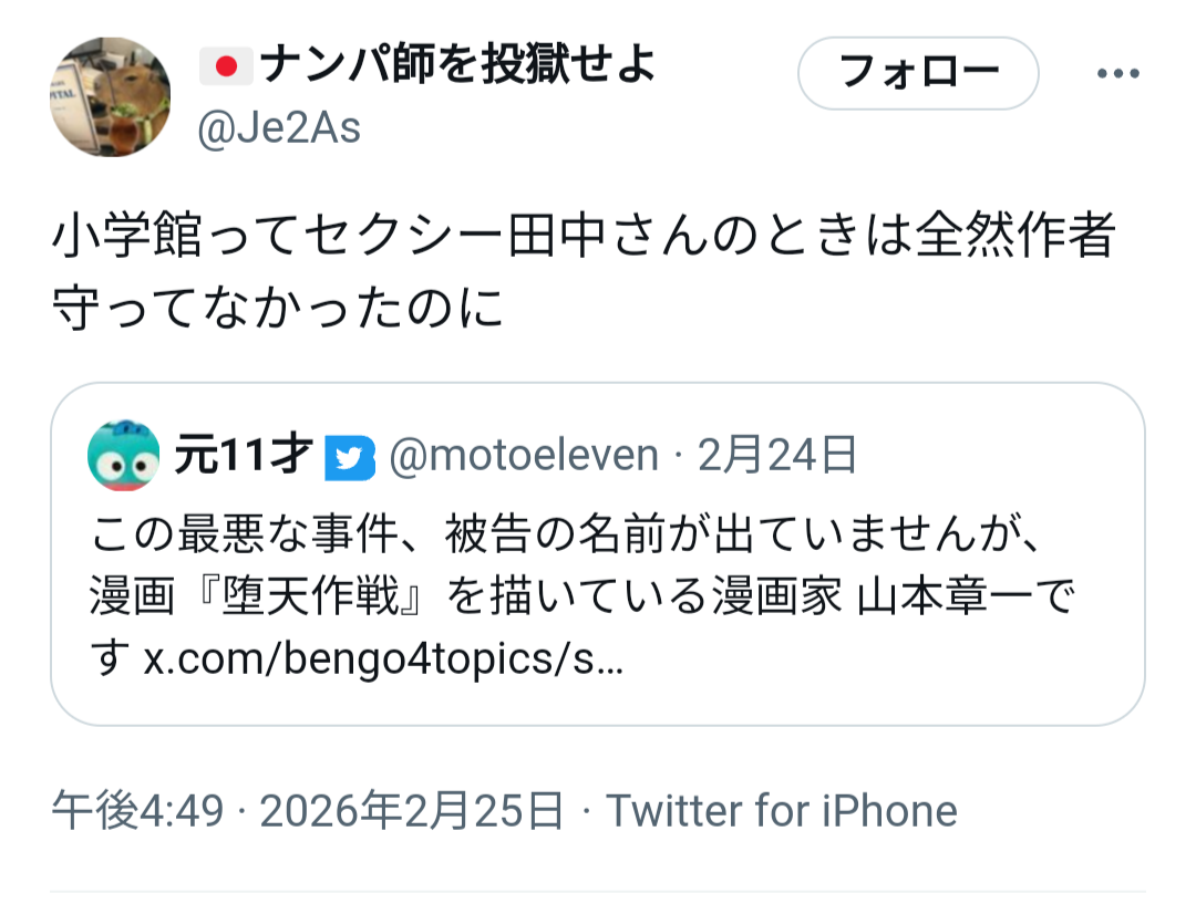 | … | 49無念Nameとしあき26/02/27(金)04:24:09No.1390285760+予言しておくけど小学館の対応としては漫画はもう終わって無関係だし編集者も外部だしでペラ紙1枚で終わりにするよ |
