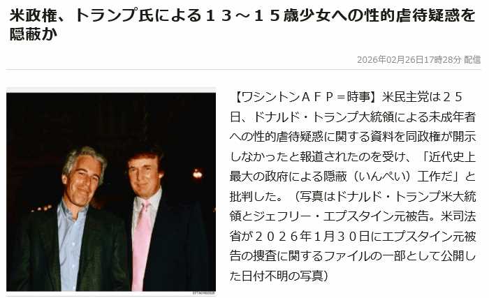 | … | 54無念Nameとしあき26/02/27(金)09:14:15No.1390303502+>エプスタインを性的虐待で訴えていた13歳の少女がトランプに対しても被害を訴えていました |