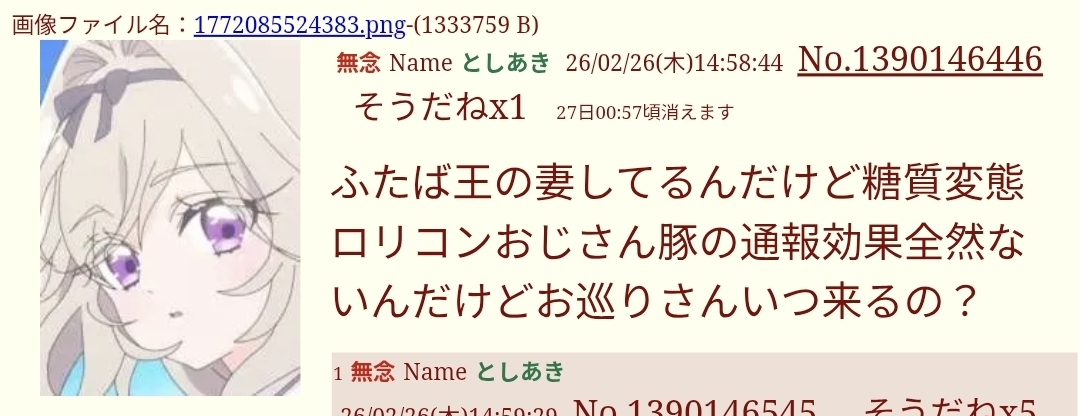 | … | 20無念Nameとしあき26/02/27(金)09:17:30No.1390303810そうだねx6 1772151450685.jpg-(15569 B) >おはのどか |