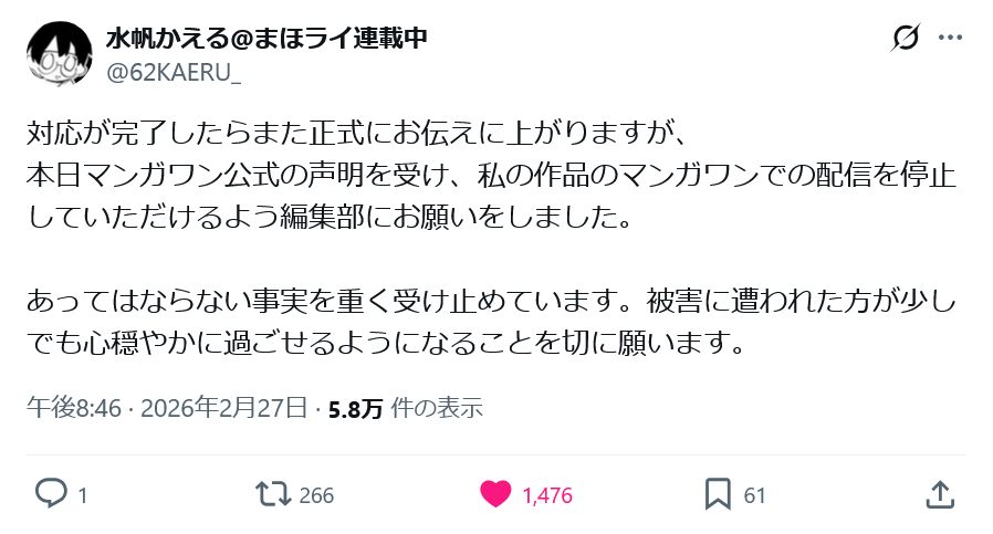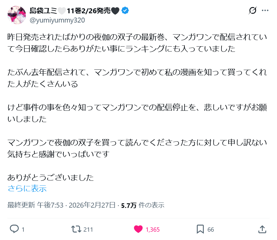 | … | 309無念Nameとしあき26/02/27(金)22:32:15No.1390453955+>こんな迅速な対応出来るのに謝罪文はどうしてアレなんだマンガワン… |