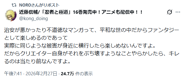 | … | 338無念Nameとしあき26/02/27(金)22:35:05No.1390454753+>忍者と極道の作者に関しては作風が作風なので |