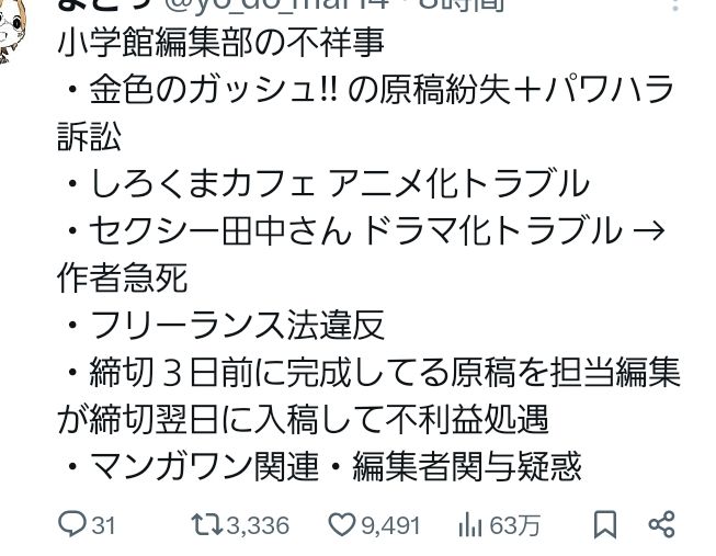 | … | 54無念Nameとしあき26/02/27(金)21:36:47No.1390437573+>マンガワンだけじゃなく小学館連載してる漫画家は全員辞めないと |