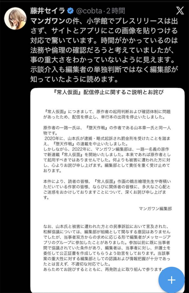 | … | 246無念Nameとしあき26/02/27(金)22:24:09No.1390451669+まぁとりあえず声明出さずにマンガワンで連載続けてる他連載陣に噛み付きさえしなければいいよ |