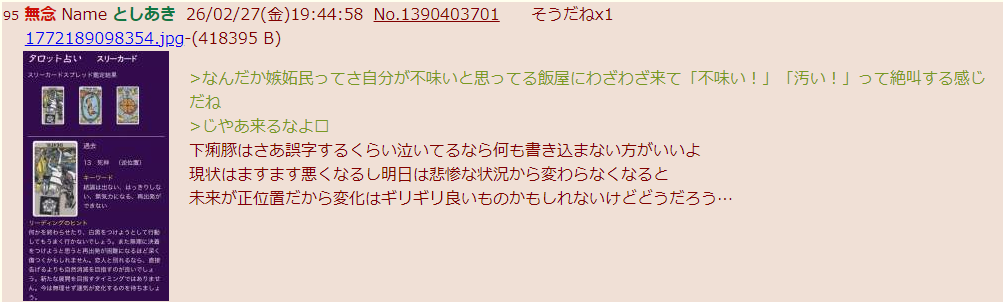 | … | 4無念Nameとしあき26/02/27(金)21:46:34No.1390440592+>障害者手帳2級持ちのソンキを躍起になって煽る姿は自分等が同列だと白状してるみたいなものでさぁ |