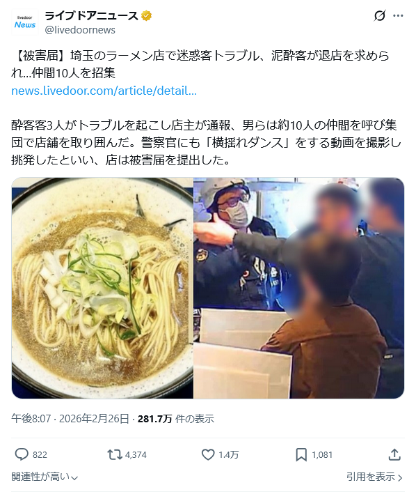 | … | 22無念Nameとしあき26/02/27(金)21:41:07No.1390438870そうだねx1 1772196067760.jpg-(57594 B) 埼玉県春日部市にある、早朝から行列ができることで知られる人気ラーメン店「煮干乱舞 本店」。9年連続で「食べログ ラーメン EAST 百名店」に選出されるなど、全国的な知名度を誇る人気店にて、前代未聞の“集団威迫事件”が発生した。ある3人の泥酔客が店内でトラブルを起こし店主が通報、男らは約10人の仲間を“召喚”し集団で店舗を取り囲んだ。警察官が駆けつけても、男らは「横揺れダンス」を踊る動画を撮影し挑発、店の防犯カメラに不遜な態度が記録されていた。店はすでに春日部警察署に被害届を提出しているという。 |