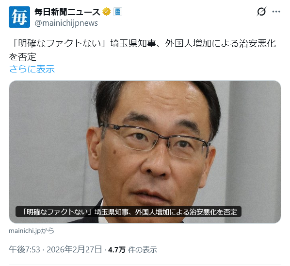 | … | 46無念Nameとしあき26/02/27(金)22:17:20No.1390449726そうだねx9誰だよこんなの知事にした奴・・・埼玉県民だわ・・・ |