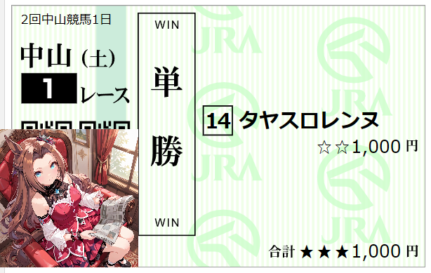 | … | 55無念Nameとしあき26/02/28(土)10:20:21 ID:qDO87r9.No.1390535430+>モーニングチャレンジ第二弾の中山01rは14番タヤスロレンスさんの単複(複勝厚め)とお相手に03番ブーケドリスさんとのワイドですわ!! |