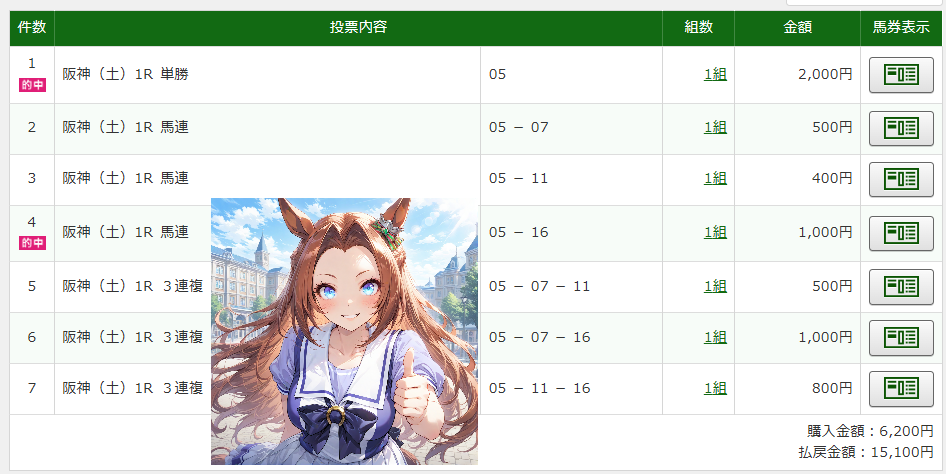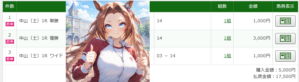 | … | 48無念Nameとしあき26/02/28(土)10:05:51 ID:JvOwJYXMNo.1390532852そうだねx3 1772240751403.png-(207263 B) モーニングチャレンジ阪神01rは05番ジャンヌドゥレーヴさんの単勝と05-16の馬連的中で+8,900円ですわ!! |