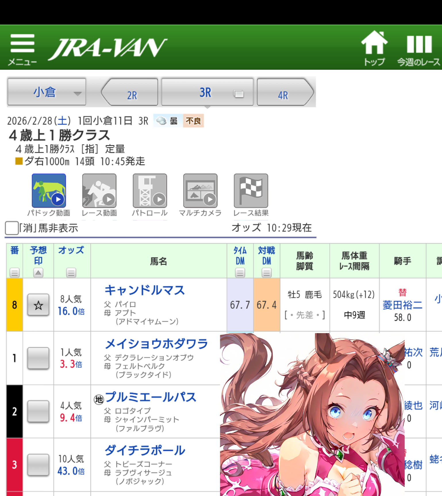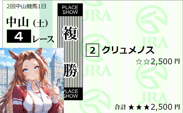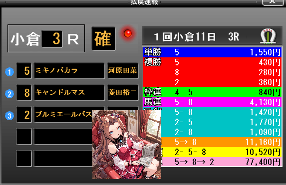 | … | 99無念Nameとしあき26/02/28(土)10:50:06 ID:j1PU8f4ENo.1390540480+小倉3rの8番が3着以内に入ってるデースネ |