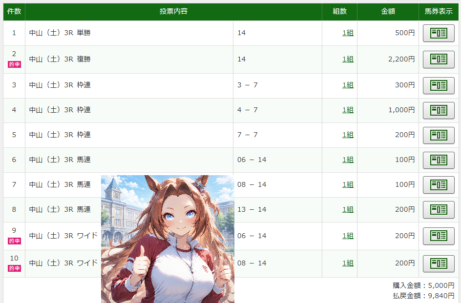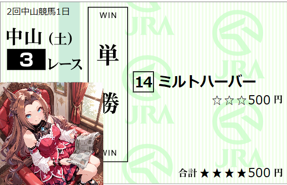 | … | 126無念Nameとしあき26/02/28(土)11:16:00 ID:JvOwJYXMNo.1390544866そうだねx1 1772244960238.png-(215362 B) 中山03rは14番のミルトハーバーさんの複勝とワイド14-06,08的中で+4,840円ですわ!! |