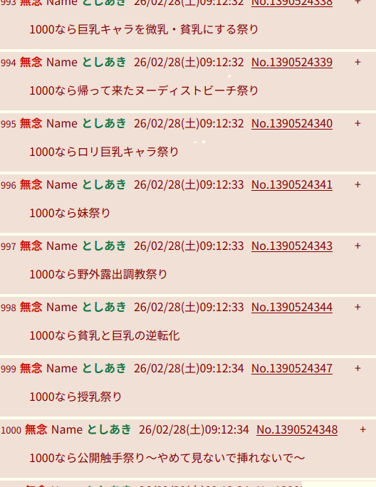 | … | 77無念Nameとしあき26/02/28(土)10:12:13No.1390534040+>>1000なら公開触手祭り〜やめて見ないで挿れないで〜 |