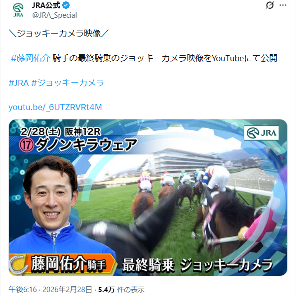 | … | 58無念Nameとしあき26/02/28(土)19:03:13No.1390642898+>https://x.com/JRA_Special/status/2027674315467178350 |