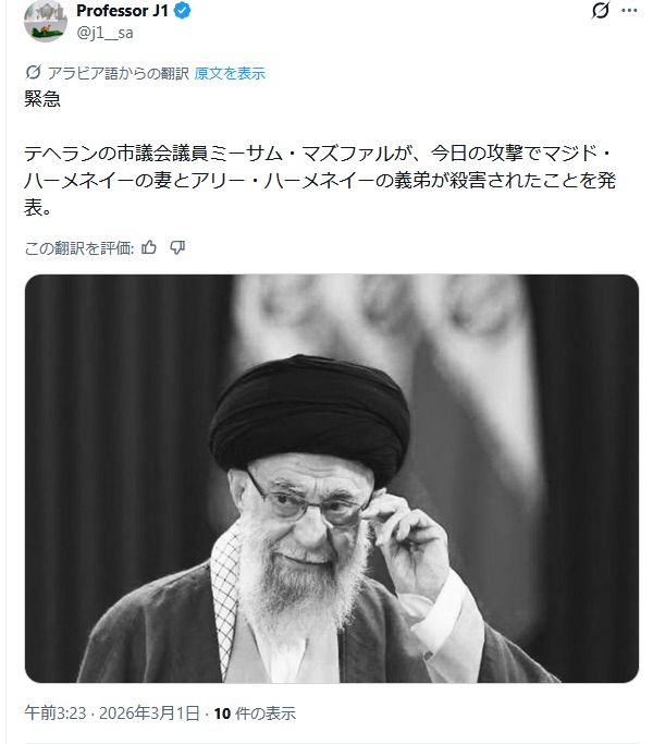 | … | 46無念Nameとしあき26/03/01(日)04:02:03 ID:us2.xfDYNo.1390757343+>イスラエル筋からだとハメネイ師は重体らしい |