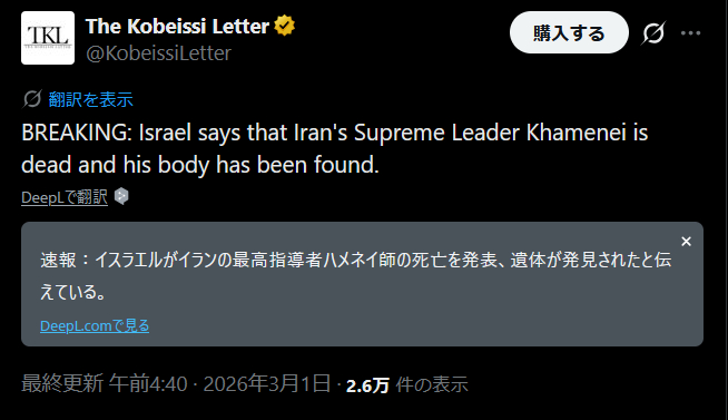 | … | 904無念Nameとしあき26/03/01(日)06:16:59No.1390763234+中東でのイスラエルの諜報力考えたらハメネイ死亡情報がフェイクなんて誰も思わないわな |