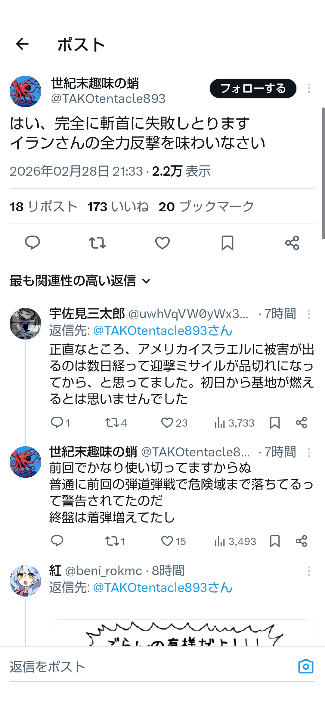 | … | 988無念Nameとしあき26/03/01(日)06:23:40No.1390763619+もしかして最初に最高指導者が死んだから全方位に反撃しだしたのか? |